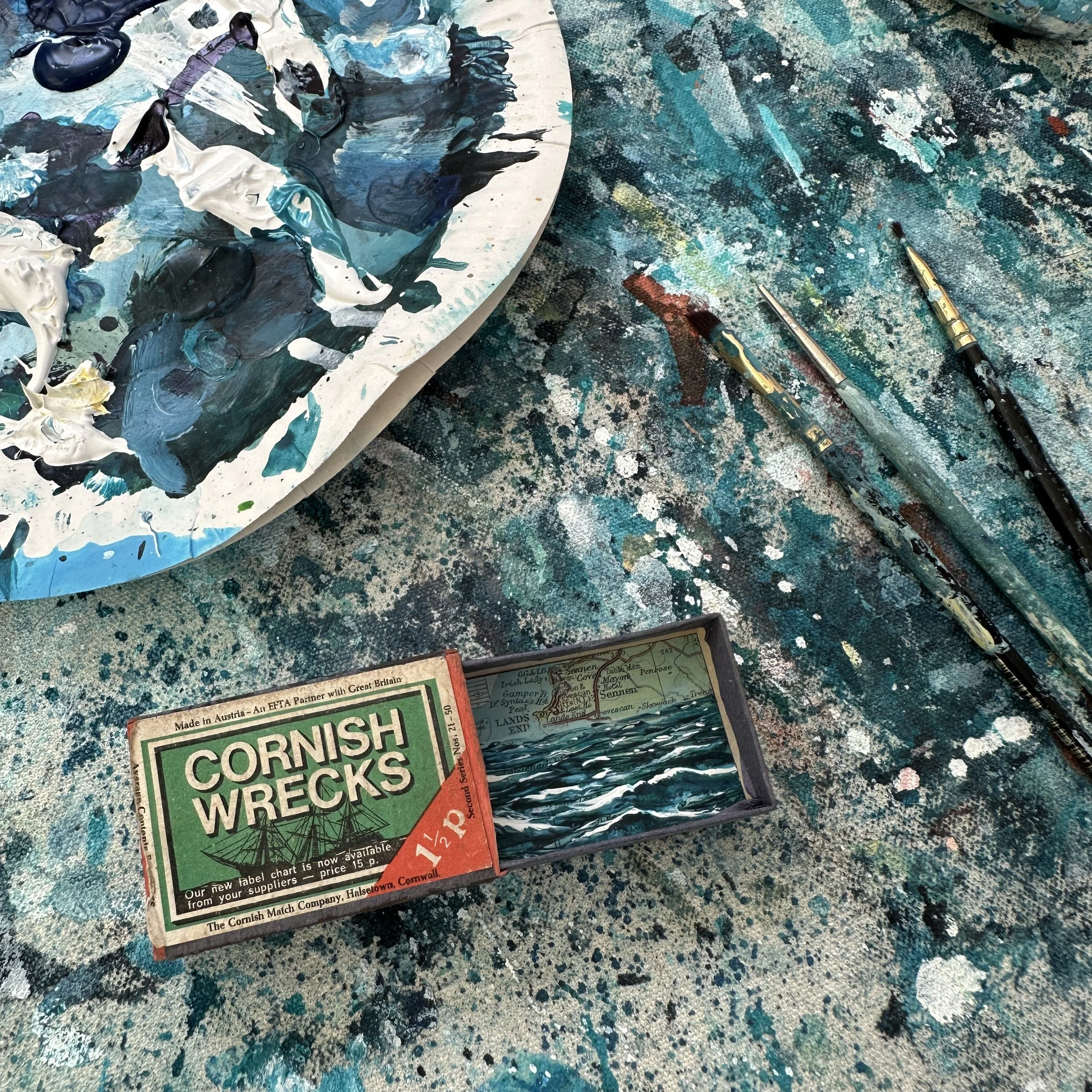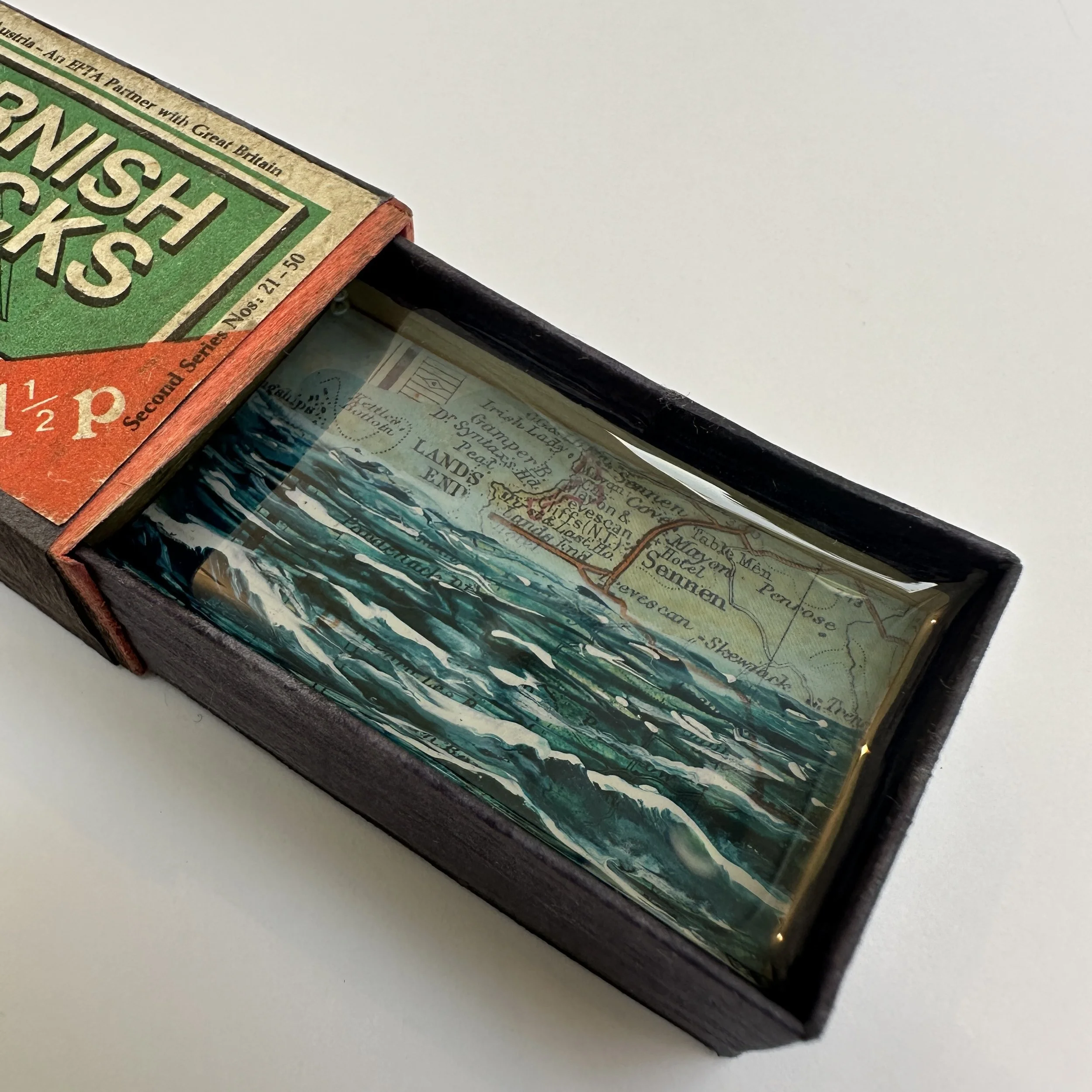 Acrylic painting cast in resin inside authentic vintage Cornish matchbox